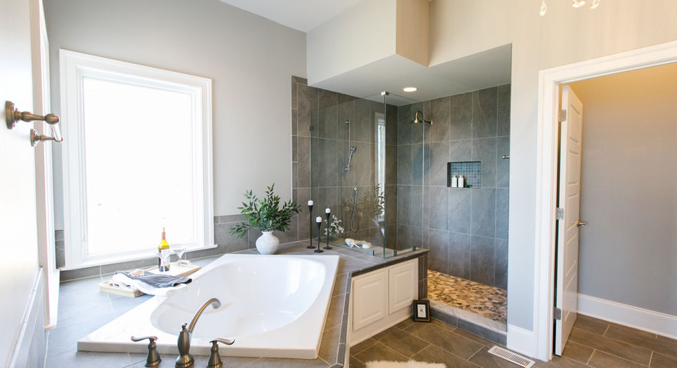 Artful use of stone accentuates hand-tiled showers, and large windows allow light to stream in over luxurious master suite tubs.